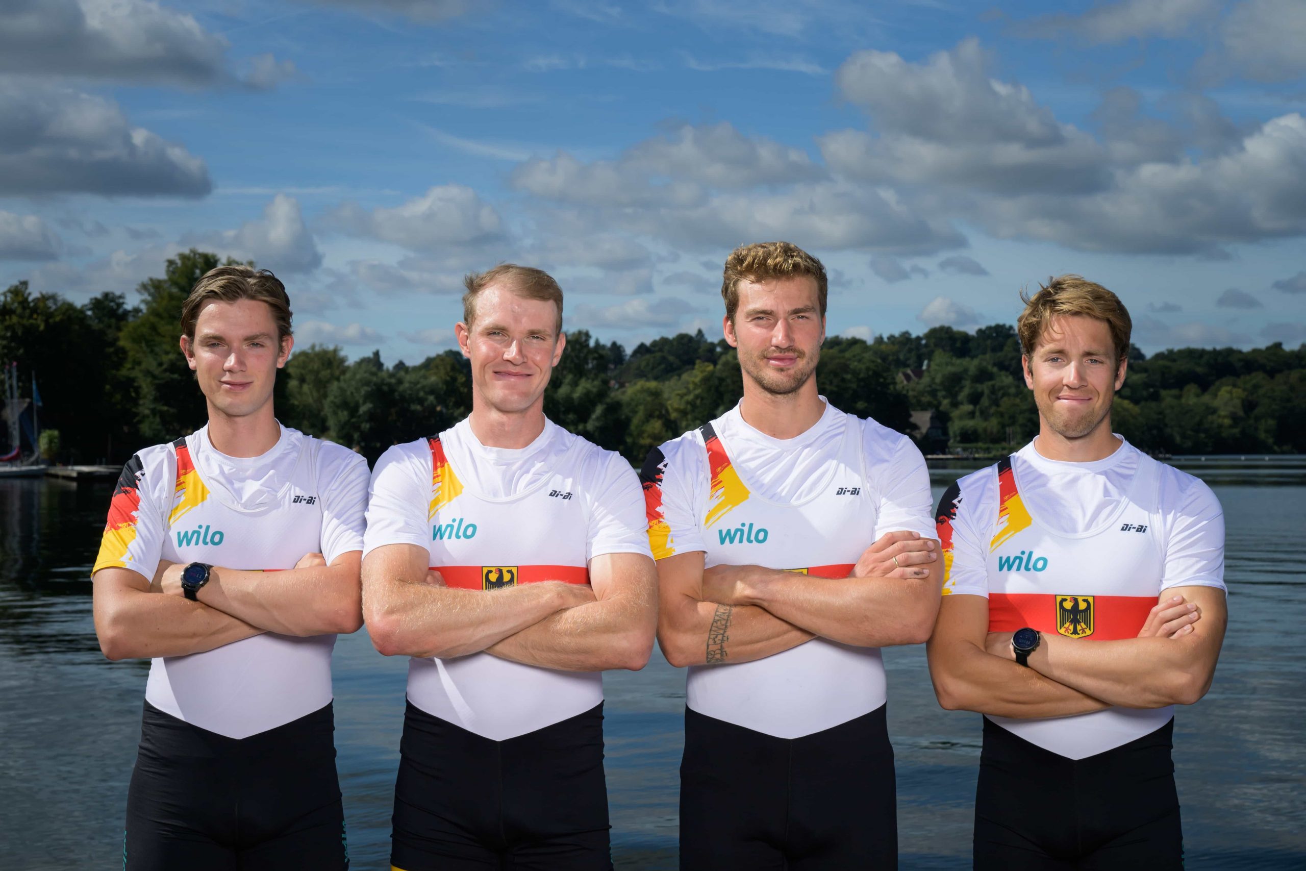 Der Deutschland-Achter, der Vierer, der Zweier und die Ersatzleute beim Fotoshooting in Ratzeburg.